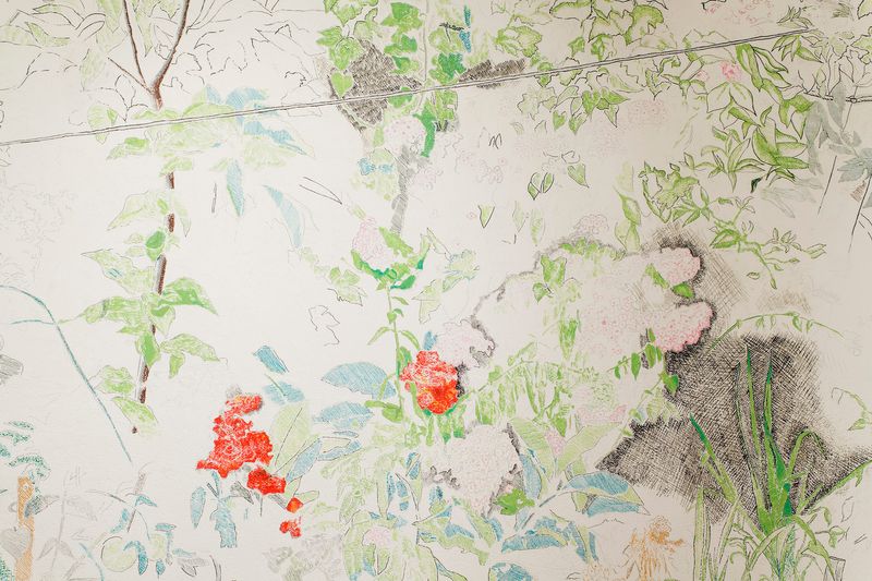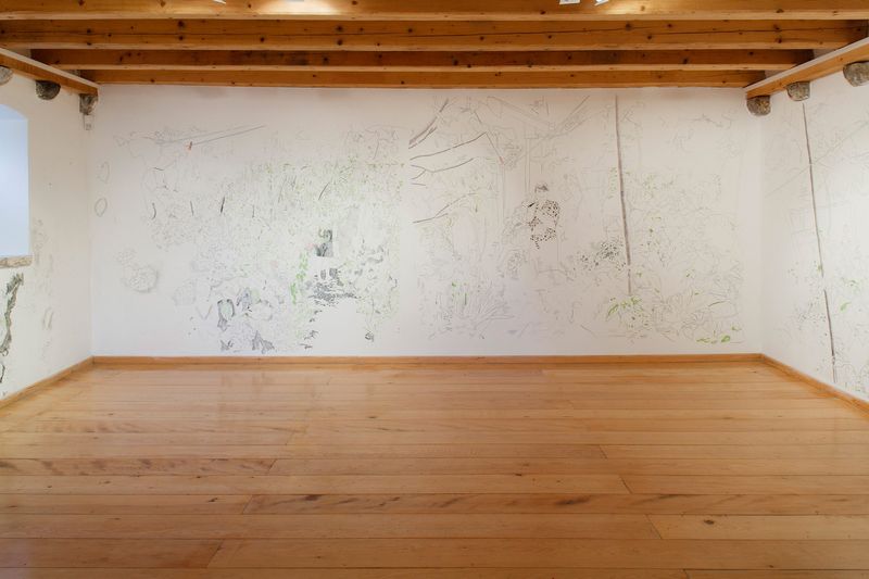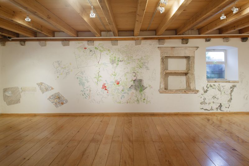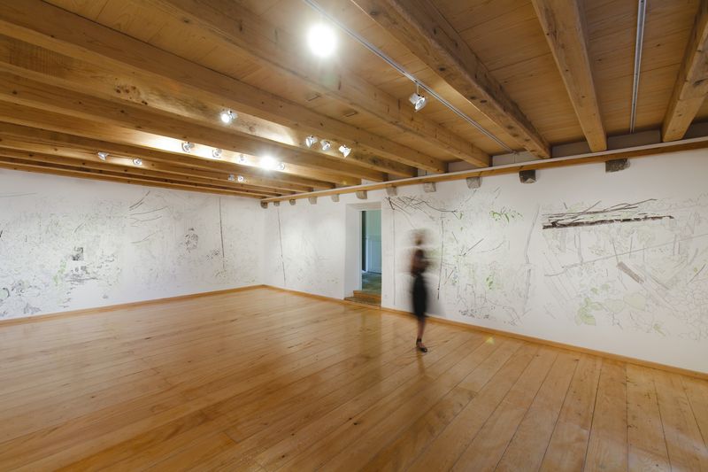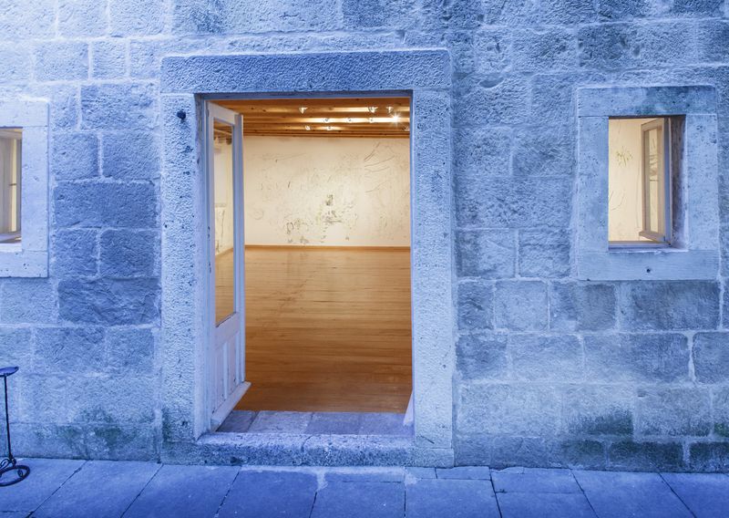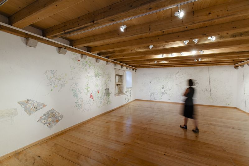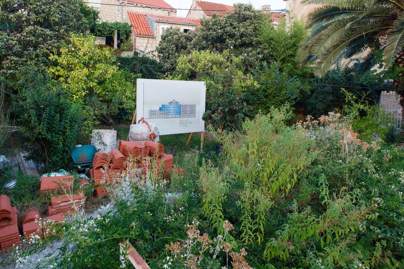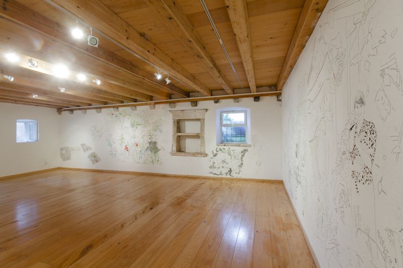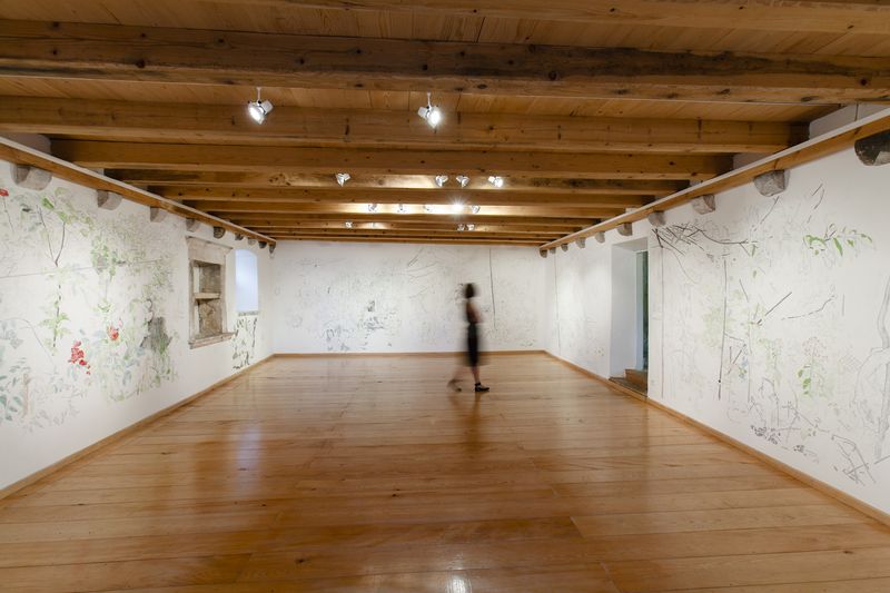 The exhibition 'As leaves fall' at the Vlaho Bukovac House Museum in Cavtat (presented within the 'Decimale' programme) introduces Amel Ibrahimović, an artist who focuses on the question of identity and a sense of belonging. Using wall drawings, the artist conveys the atmosphere of his grandparents' Bosnian garden to the Museum's space where Vlaho Bukovac was born and where he lived for some time. The garden, which is almost a must in every house in Cavtat, has been closed in the inner space in a way to emphasise its particularity and universality by blending 'korta' and 'avlija'. In addition to the drawings on the walls, a number of children's one-minute drawings have been displayed in the foyer. The drawings have been made based on the paintings by Danish and European surrealists who are considered to be the foundation of European modern art. Ibrahimović places a billboard with an architectural drawing made by his father in 1997 in the Museum's upper garden ( a potential building site) in order to emphasise the overall atmosphere of mass tourism and 'entrepreneurship'. His father made the drawing for the project called 'Business Kalesija – Ways to acquire office space' and Ibrahimovic uses it as a paradigm for commercializing space.
